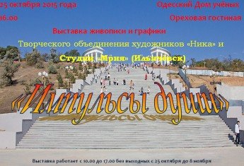 В воскресенье, 25 октября, в Одесском доме учёных, что в самом центре Одессы возле Сабанеева моста, пройдёт выставка живописи и графики творческого объединения художников «Ника» студии «Мрия», город Ильичёвск.
