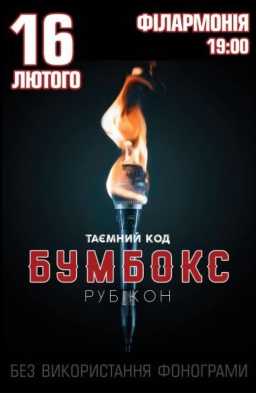 16 февраля в Одесской филармонии выступит легендарная украинская группа «Бумбокс». На концерте музыканты представят новый альбом под названием «Таємний код: Рубікон», который записывали в Украине, Франции и Соединенных Штатах Америки. Он состоит из двух частей и в него вошло больше 11 музыкальных композиций. Такое количество треков представлено впервые за 15 лет существования группы.