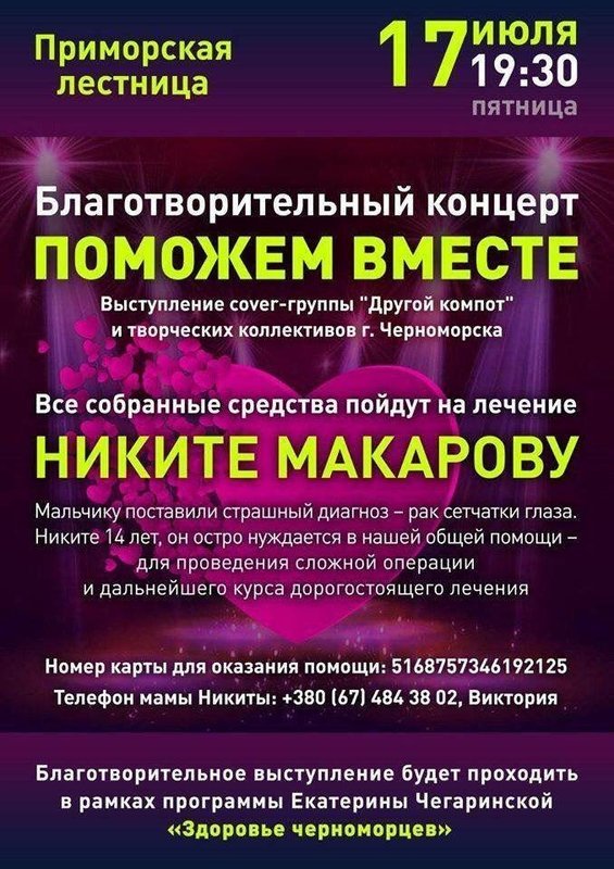 Сегодня, 17 июля, в Черноморске пройдёт благотворительный концерт «Поможем вместе».