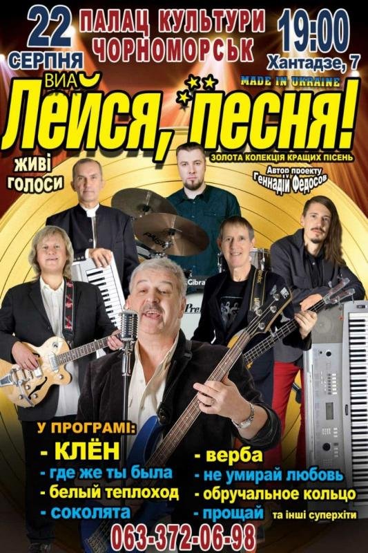22 августа в 19:00 жителей Черноморска и гостей города порадует своим концертным выступлением советский вокально-инструментальный ансамбль «Лейся, песня». Вы сможете услышать такие хиты, как обручальное кольцо, клен, где же ты была, белый теплоход, соколята, верба. не умирай любовь и другие музыкальные композиции.
