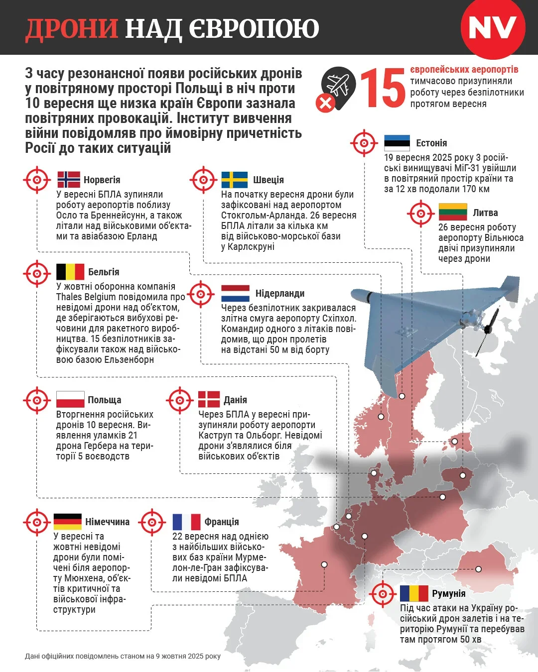 Увечері 9 листопада над атомною електростанцією Доел у Бельгії помітили три невідомі безпілотники. З жовтня у країні неодноразово фіксували польоти безпілотників над військовими базами та аеропортам.