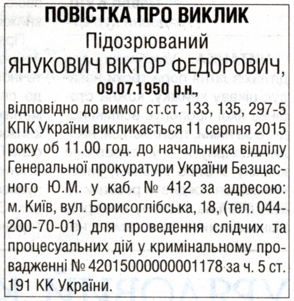"Подозреваемый Янукович Виктор Федорович (…) вызывается 11 августа 2015 года на 11.00 к начальнику отдела Генеральной прокуратуры Украины Безщасному Ю.М. (…) для проведения следственных и процессуальных действий в уголовном производстве №42015000000001178 по ч. 5 ст. 191 УК Украины", - говорится в сообщении.